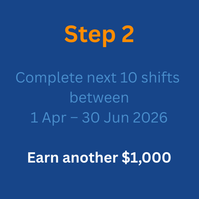 A further AUD $1,000 will be paid upon completion of an additional 10 shifts worked between 1 April 2026 and 30 June 2026. -