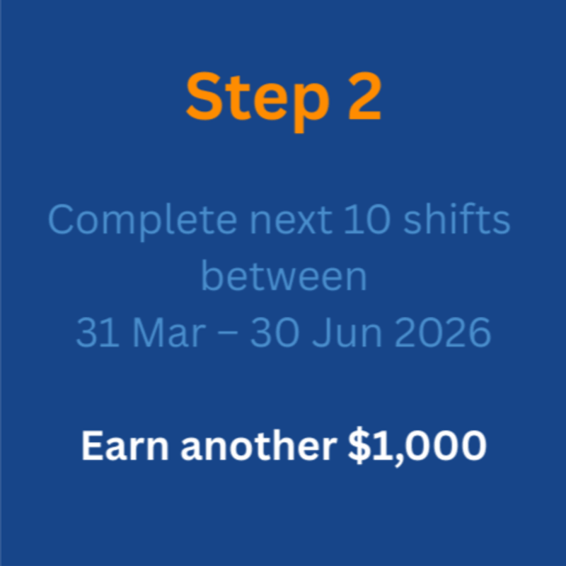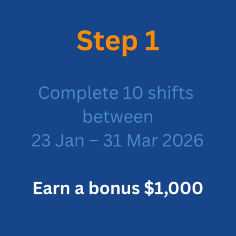 A bonus of AUD $1,000 will be paid upon completion of the first 10 shifts worked between 23 January 2026 and 31 March 2026. - Second Payment: